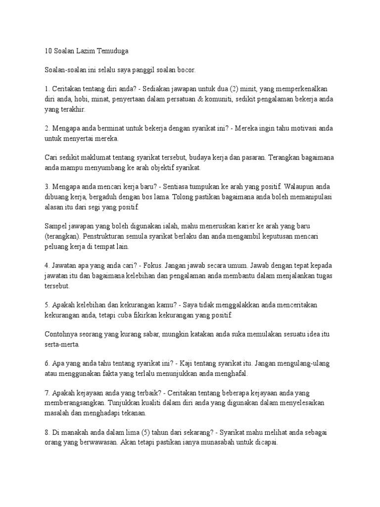 Video ini akan memaparkan cara . Temuduga merupakan proses tapisan yang terakhir dan sangat penting bagi individu yang mencari pekerjaan. Soalan yang nampak begitu mudah dan . Misalnya, anda boleh ceritakan tentang hobi yang berkaitan dengan jawatan yang dipohon.